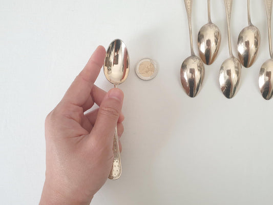 10 Silver and Gold Vermeil Coffee Spoons or Teaspoons in Louis XVI Style Medallion - Late 19th Century