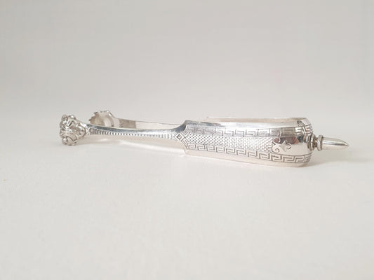 Antique 950 Silver Sugar Tongs by Philippe Berthier, Paris - Featuring Engraved Greek Key Frieze and Lion's Claw-Shaped Grips