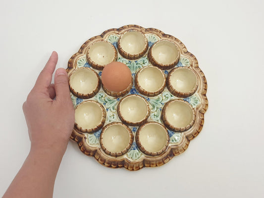 Antique Belgian Wasmuel Majolica Barbotine Twelve Cup Egg Stand Server circa 1890