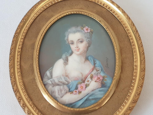 Antique 19th Century Hand Painted French School Miniature Portrait of a Lady with Flowers, Signed GAMET, in Gilded Bronze Medallion Frame