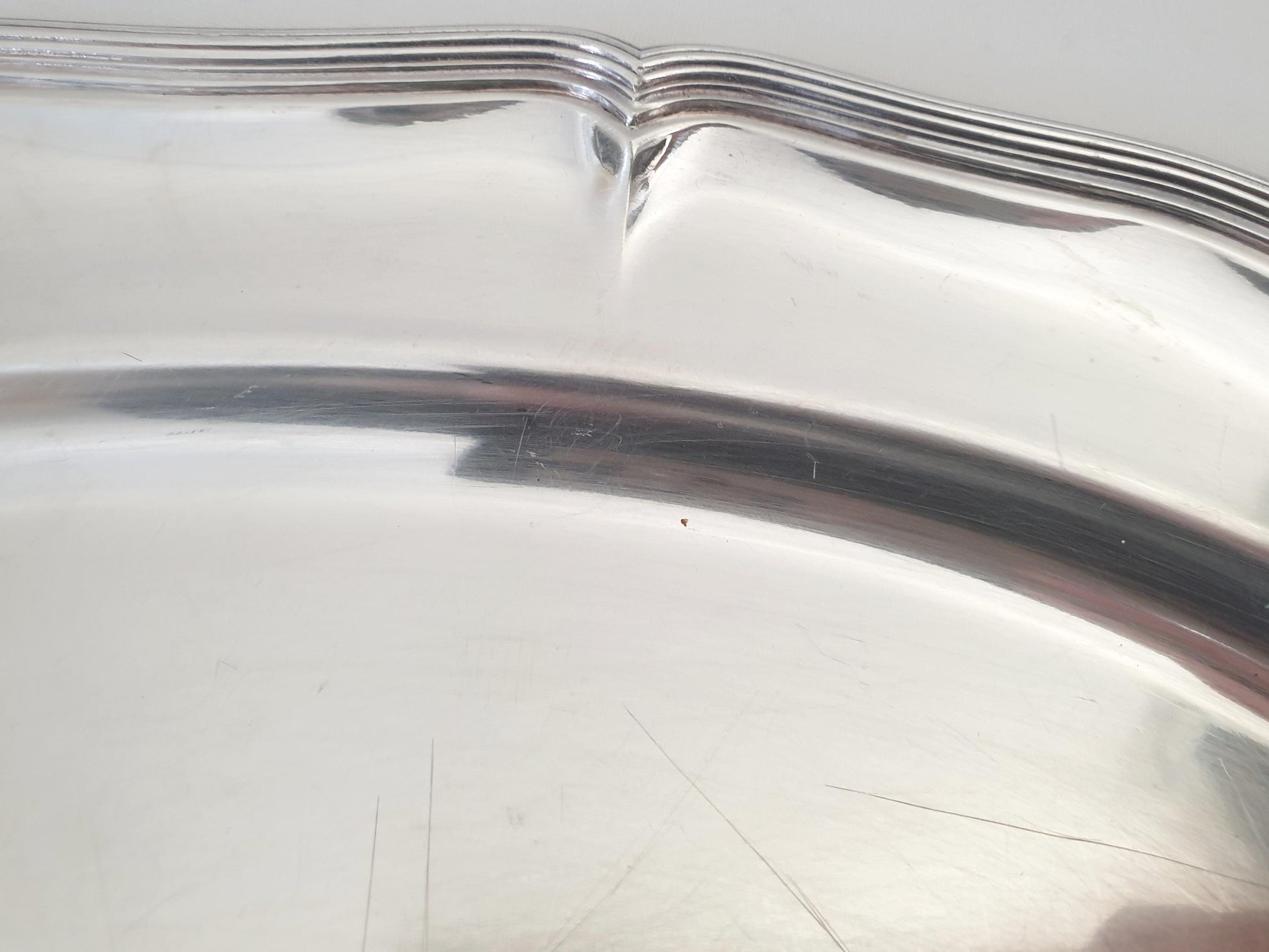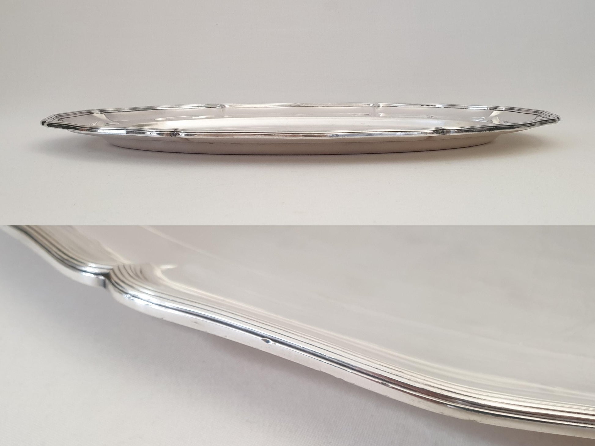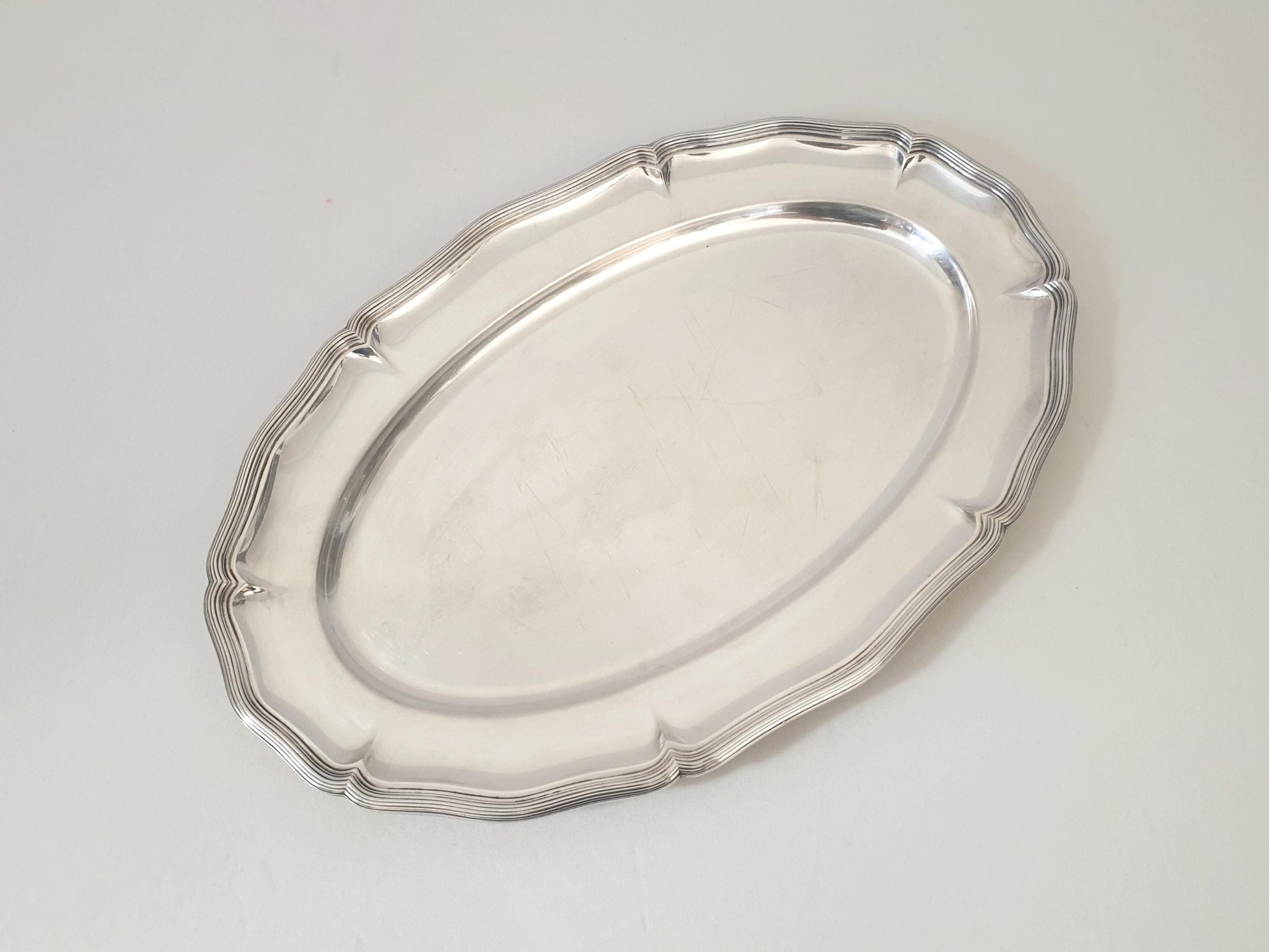 French vintage oval serving tray in silver plate by Christofle Gallia, featuring an elegant contoured rim and generous size, ideal for serving, display, or use as a table centerpiece, and stamped with the Christofle Gallia hallmark on the reverse.
