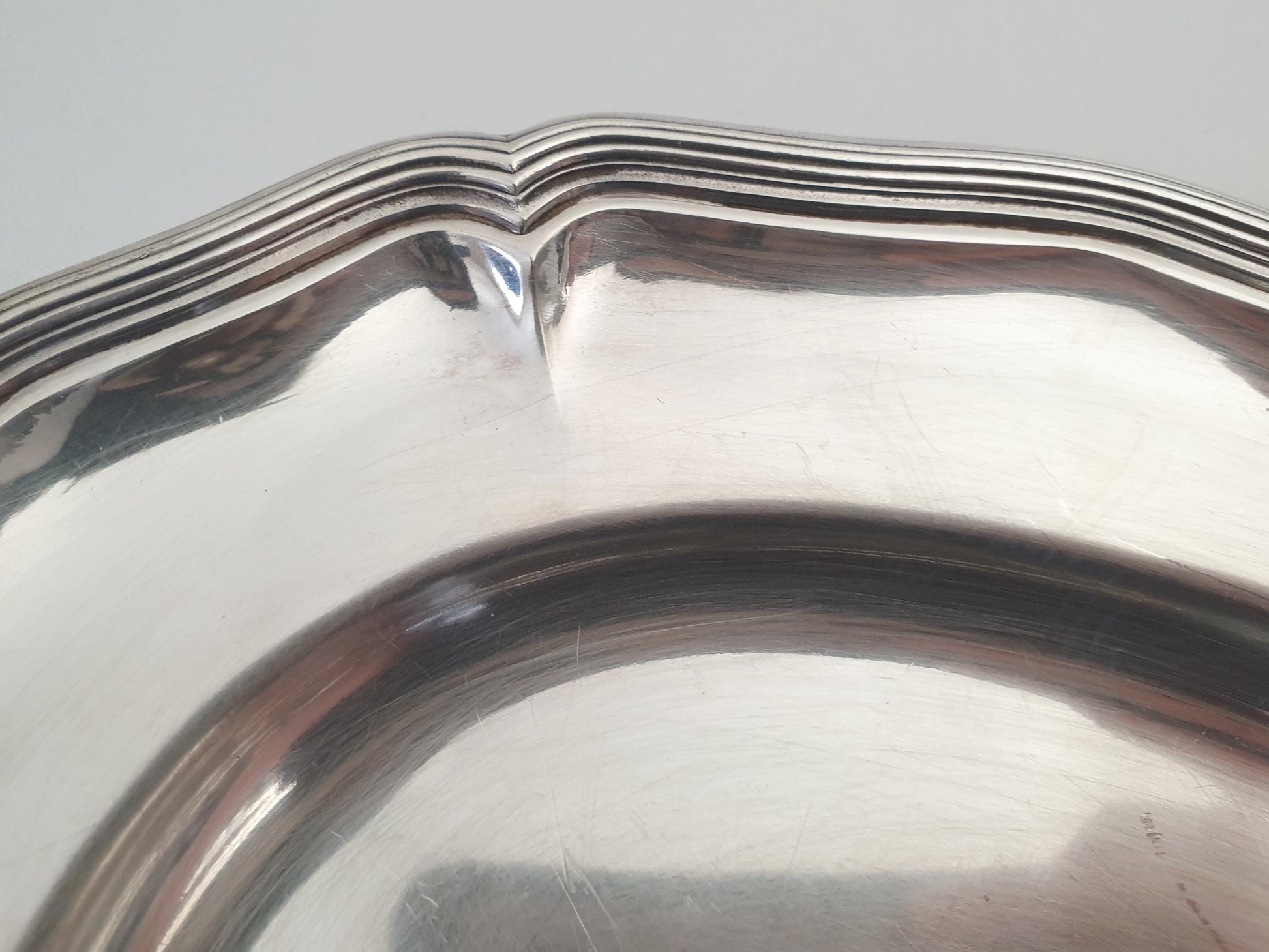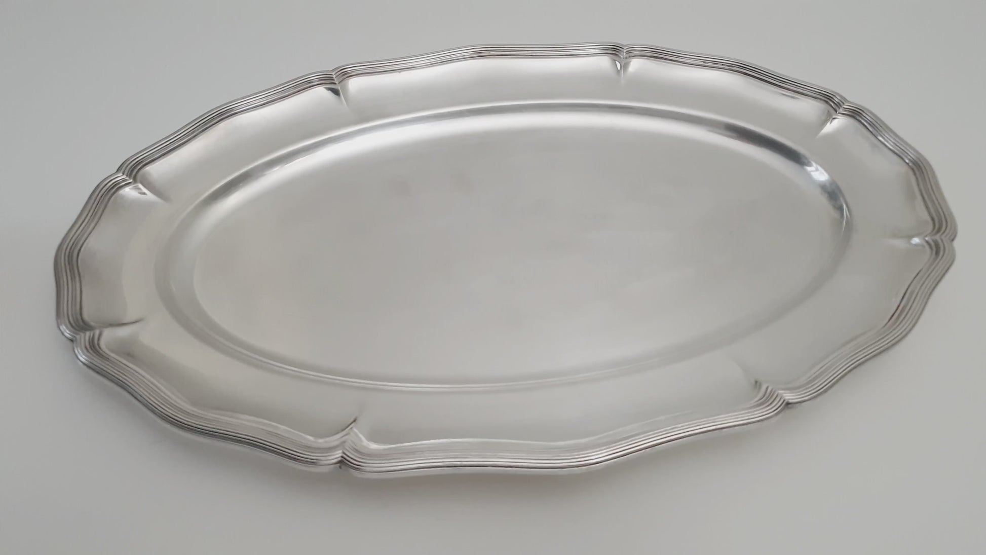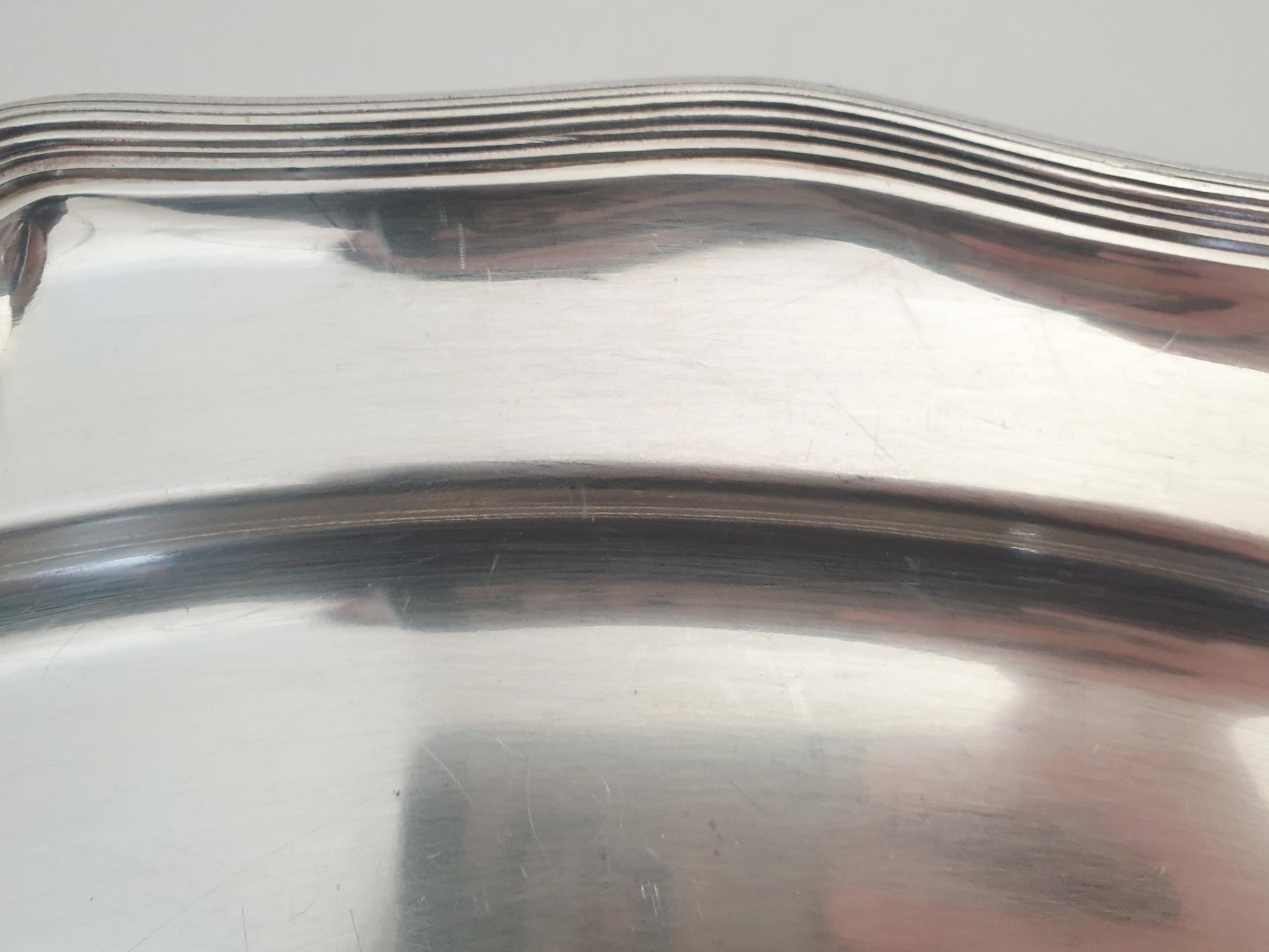 French vintage oval serving tray in silver plate by Christofle Gallia, featuring an elegant contoured rim and generous size, ideal for serving, display, or use as a table centerpiece, and stamped with the Christofle Gallia hallmark on the reverse.
