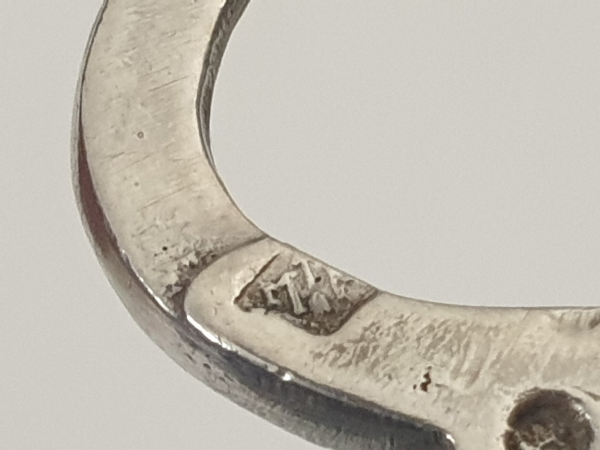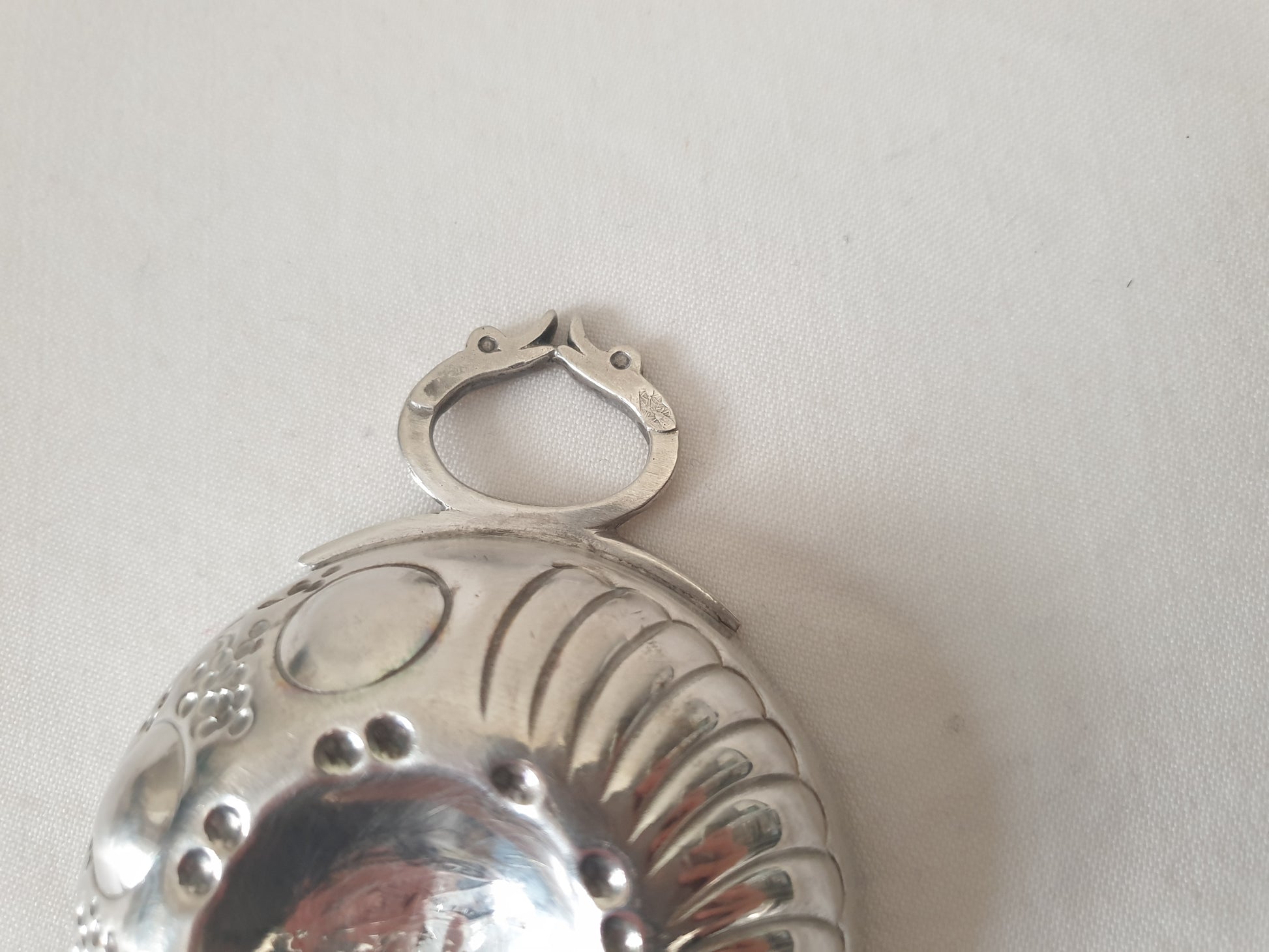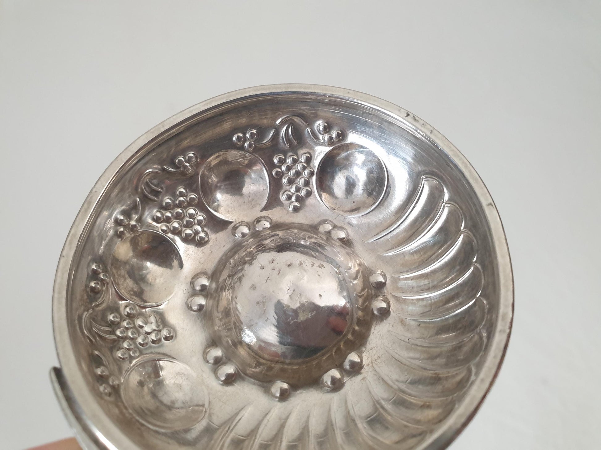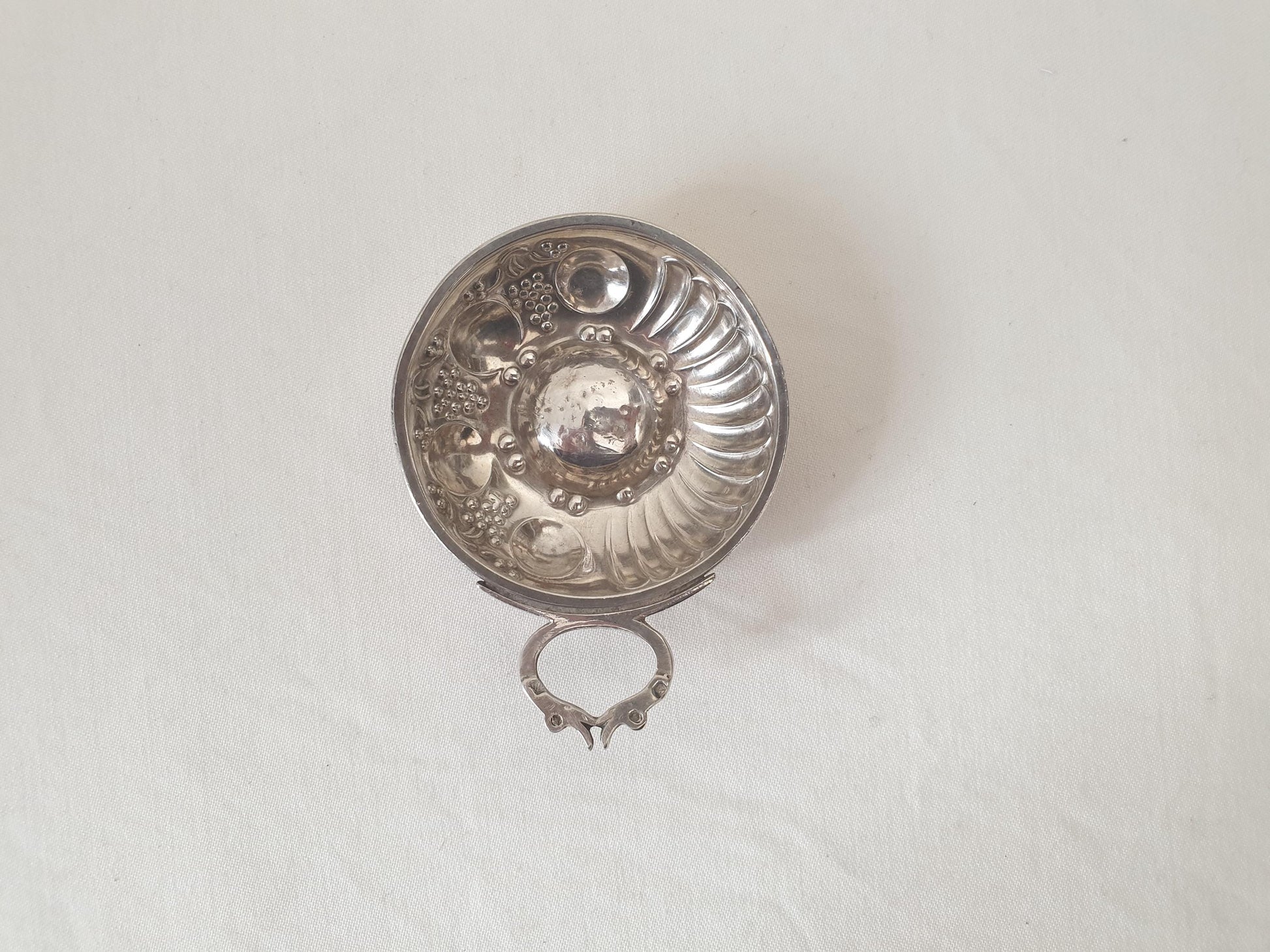 Antique French 950 silver Bourgogne wine taster (tastevin) by Marc Parrod, Dijon (active 1903–1944). This finely crafted piece features a serpent-shaped handle and a richly detailed bowl decorated with grape clusters and vine motifs. Hallmarked with the Minerva 1st Standard and Bigorne (insect) marks, guaranteeing 950 silver purity, along with the maker’s mark “MP” for Marc Parrod. A beautiful example of early 20th-century French silversmithing, both collectible and functional.