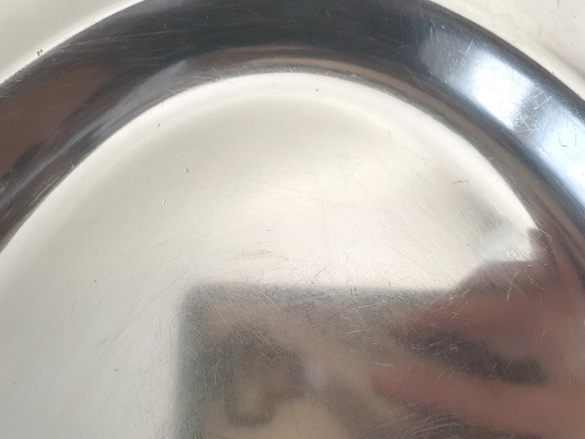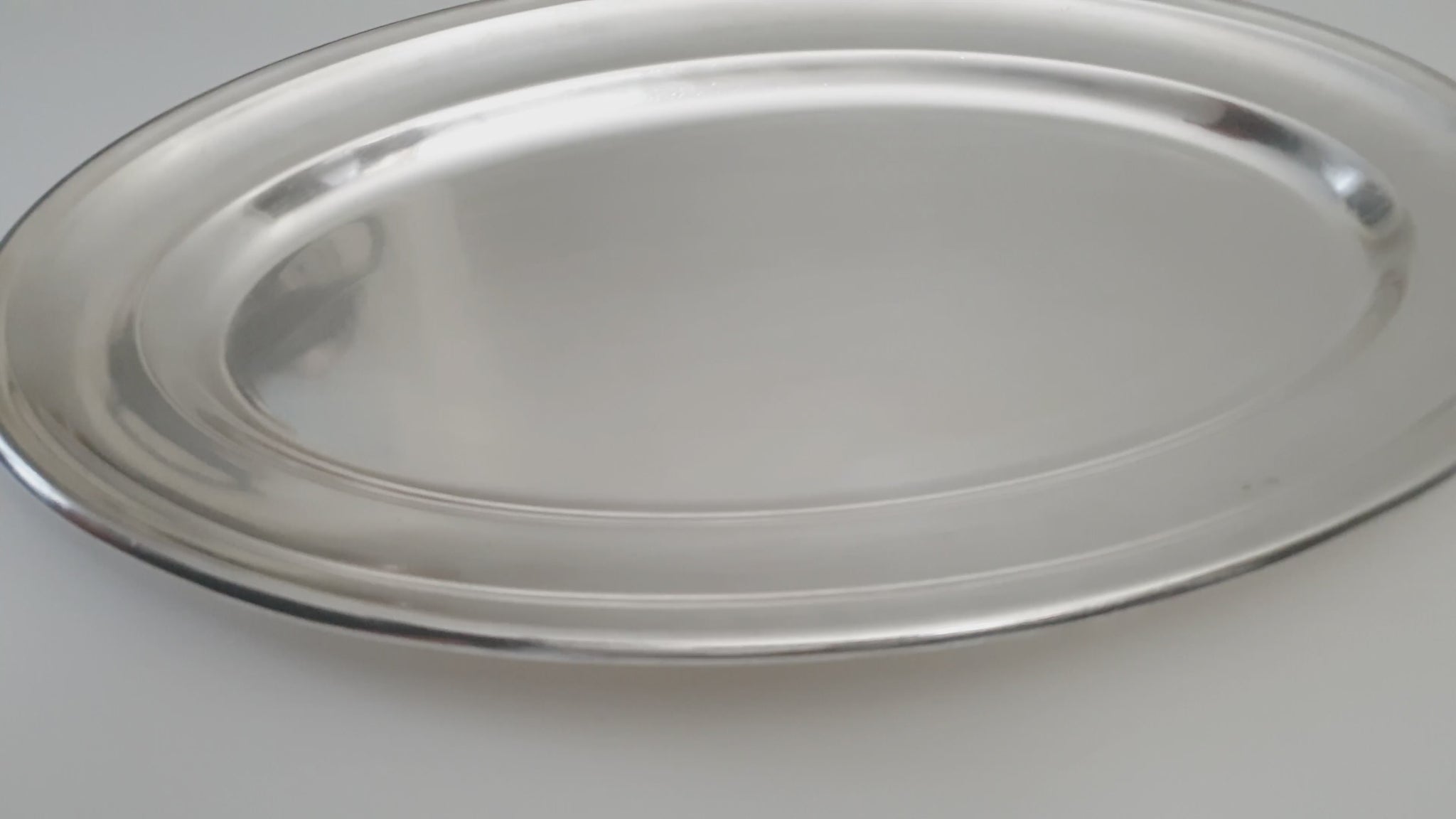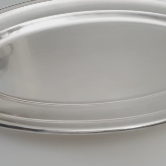 French large oval serving tray in silver plate, featuring a smooth minimalist design with clean contours and a classic rim. This elegant vintage platter is versatile for serving, entertaining, or use as a refined table centerpiece, and adds timeless French style to any dining setting.