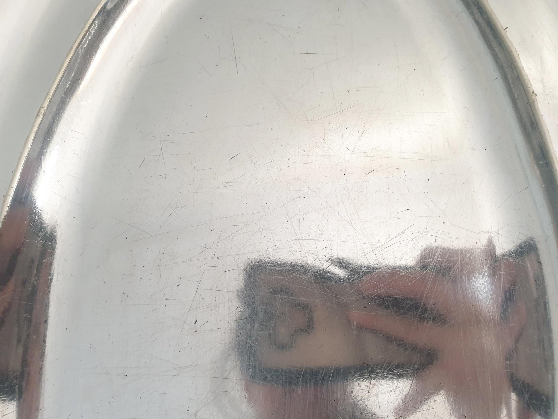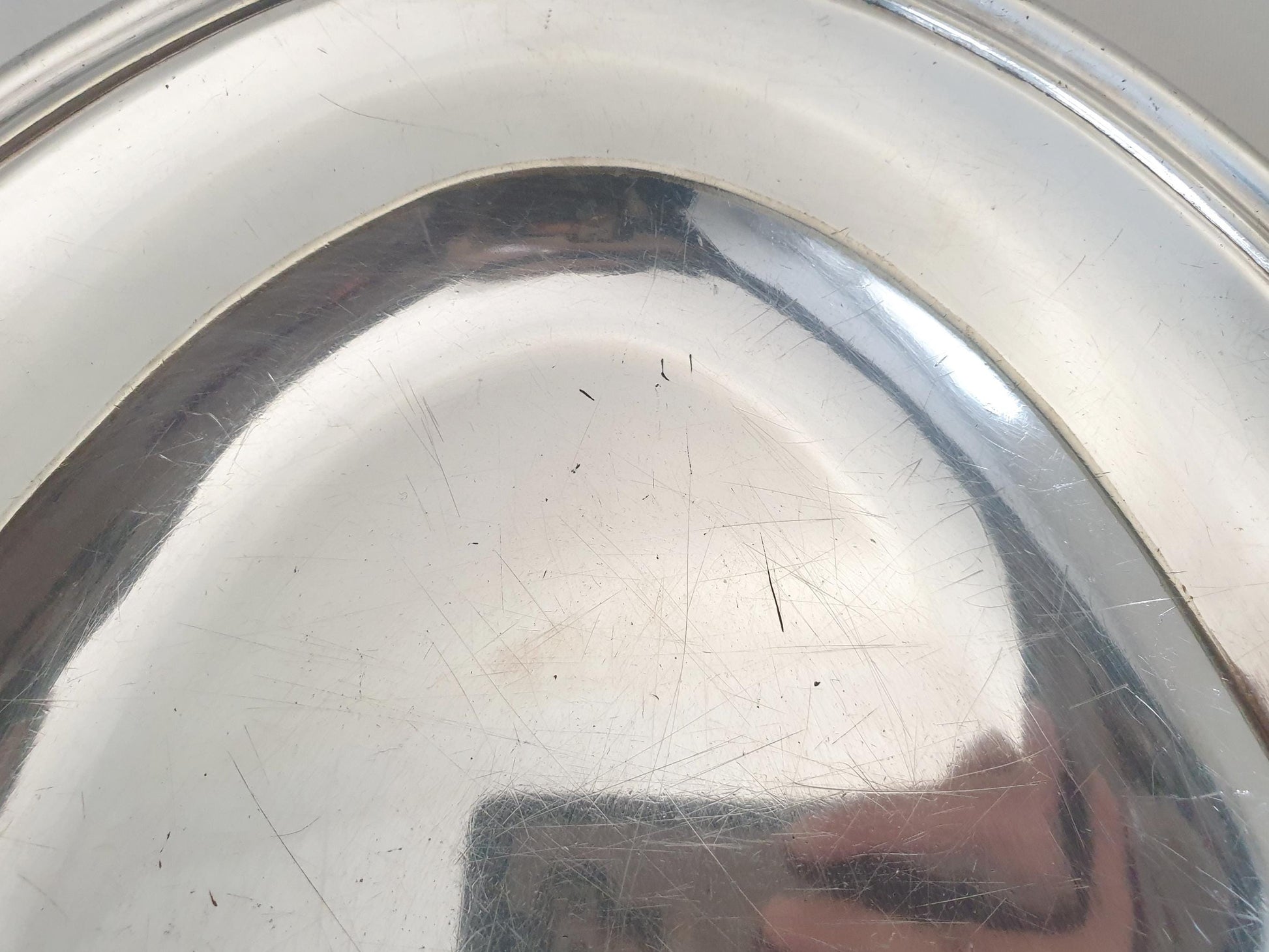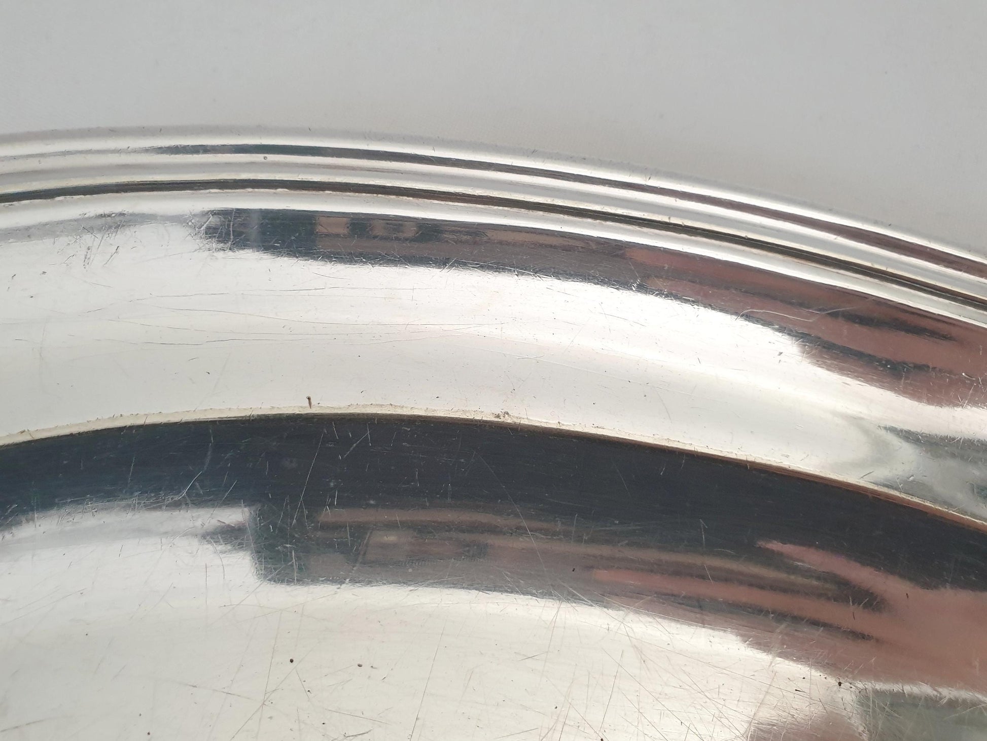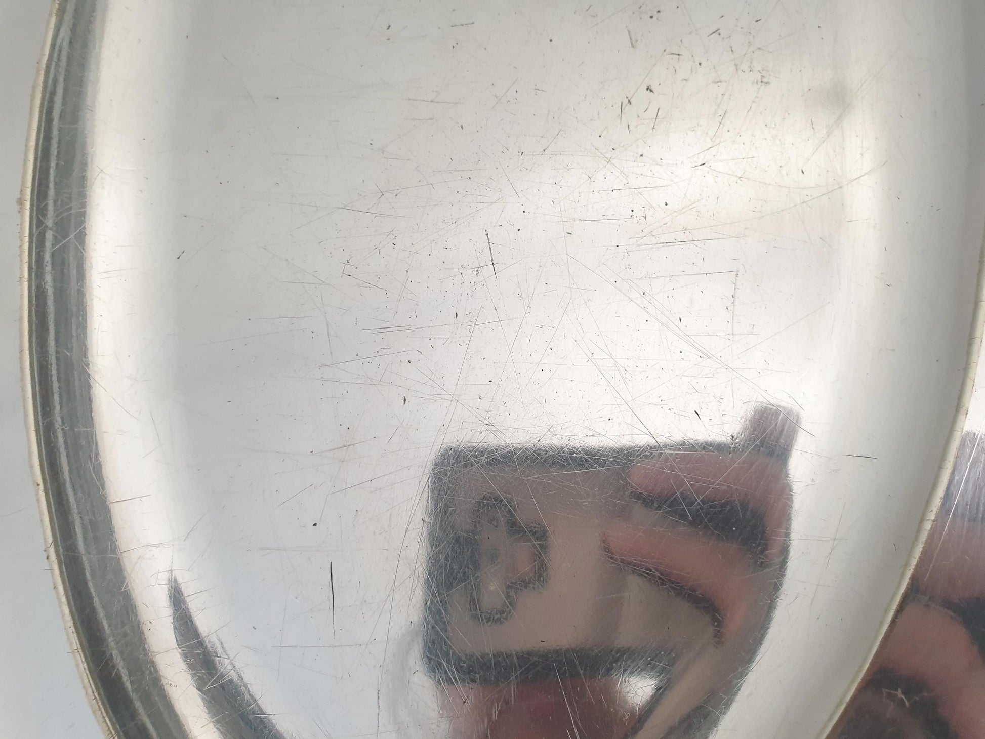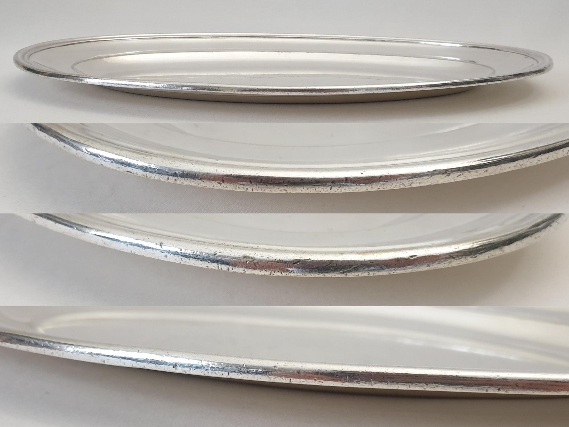 Large French vintage oval serving tray in silver plate, designed with a smooth rim and classic minimalist contours, ideal for serving, entertaining, or use as a table centerpiece.