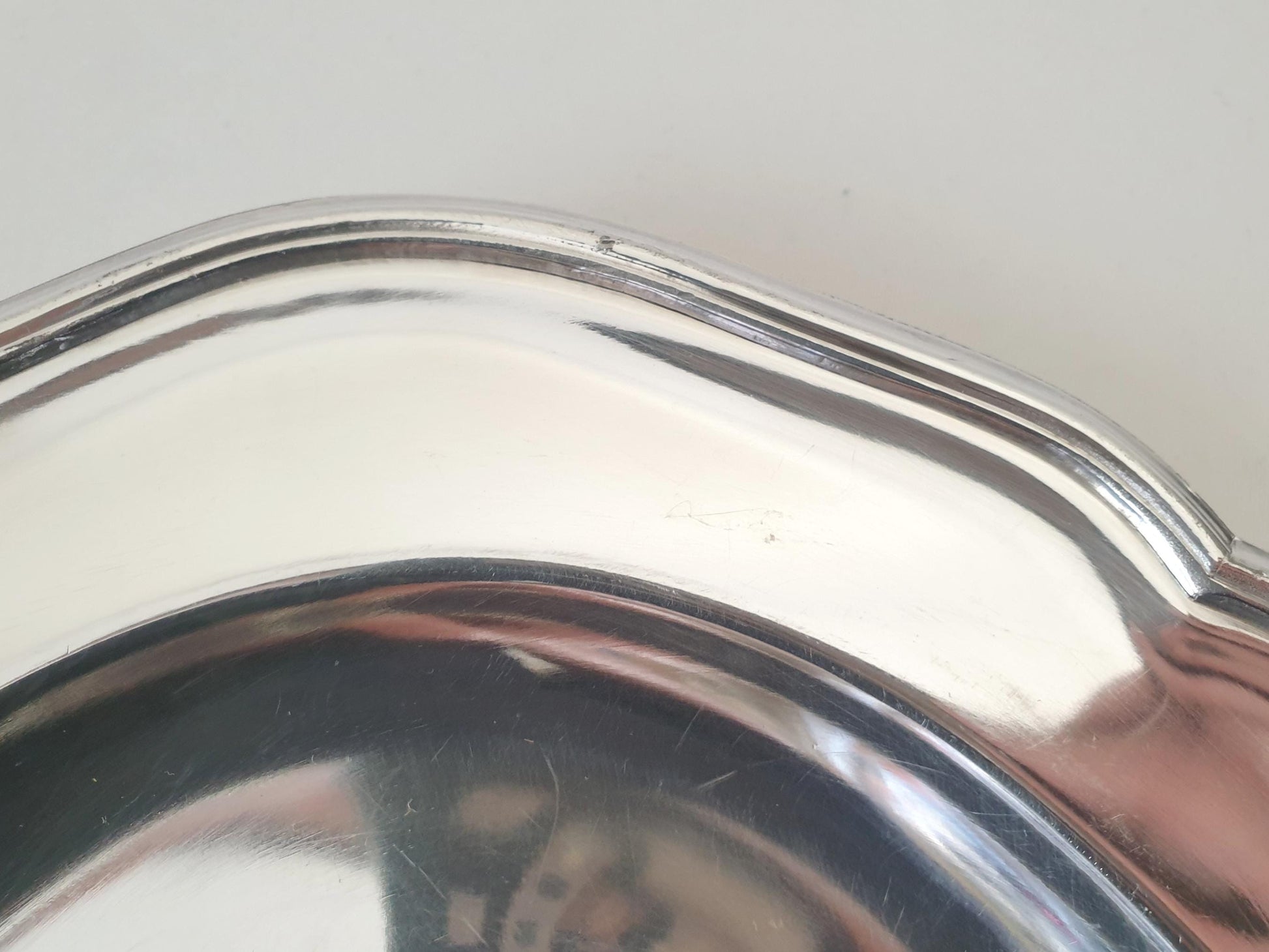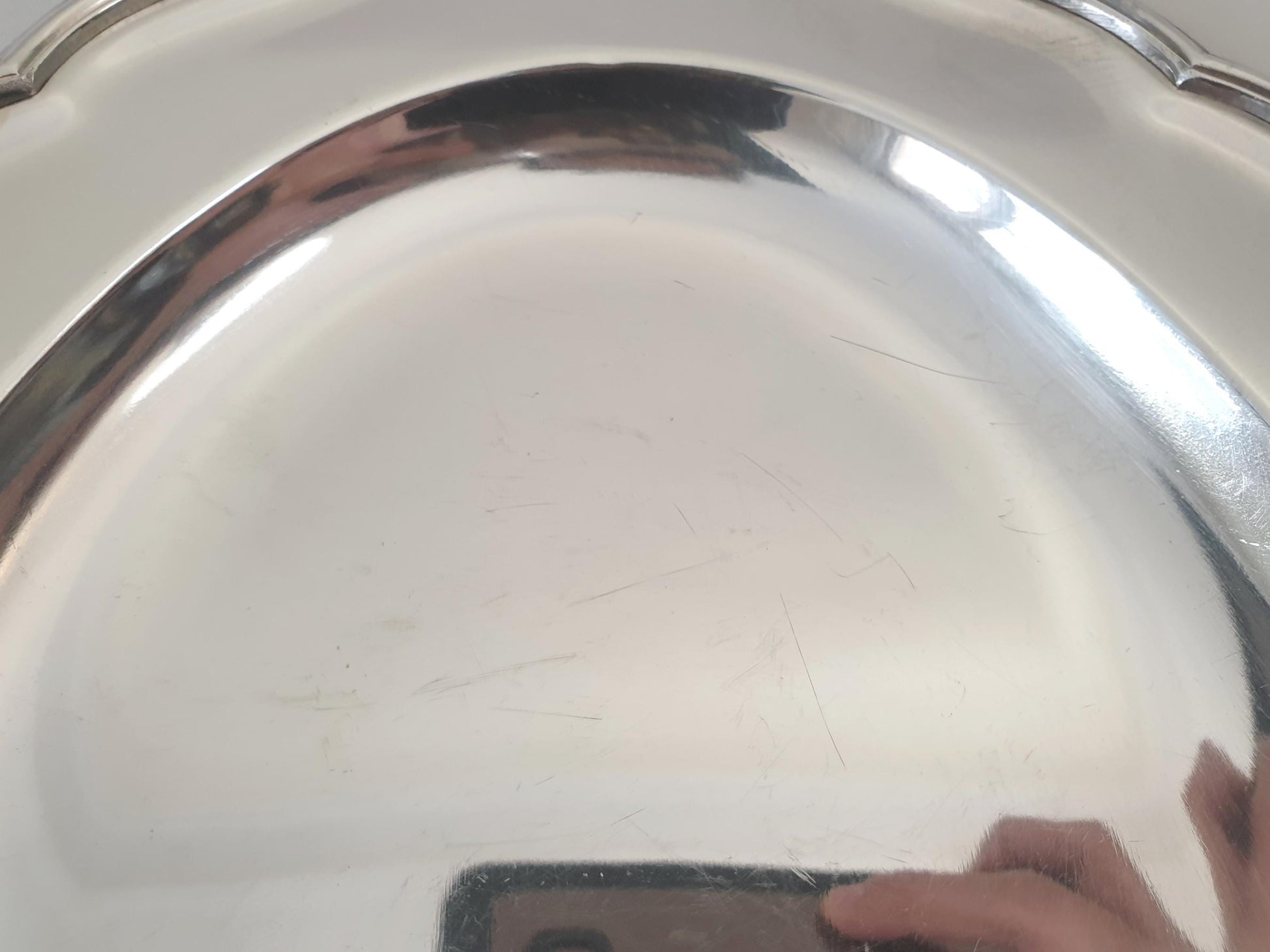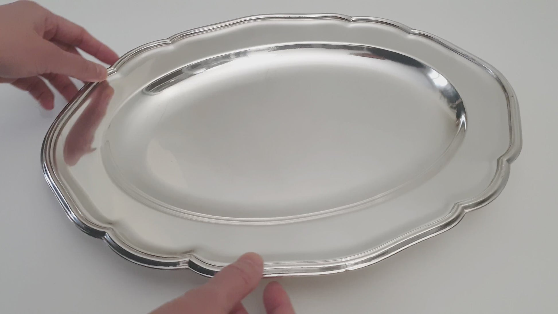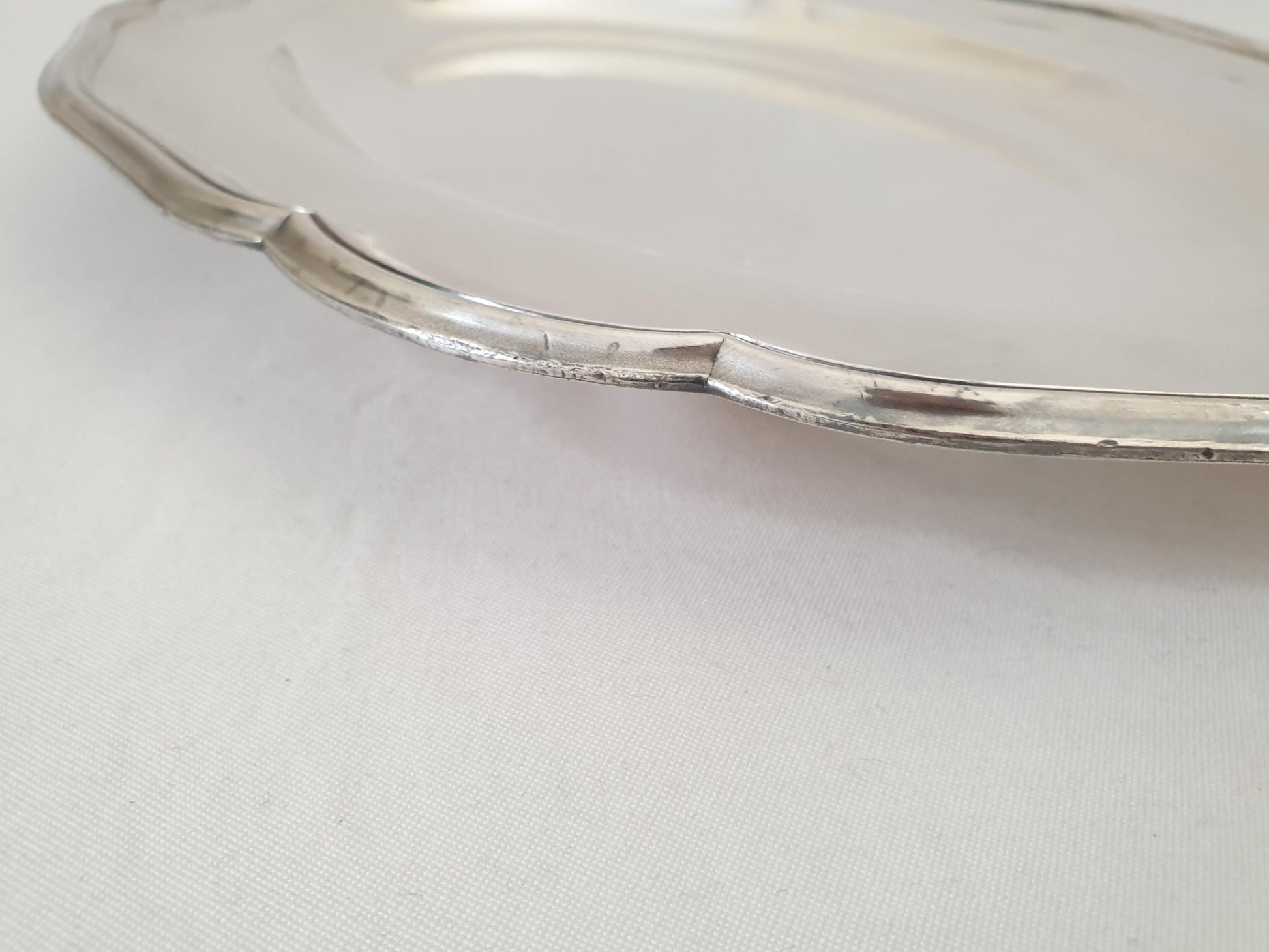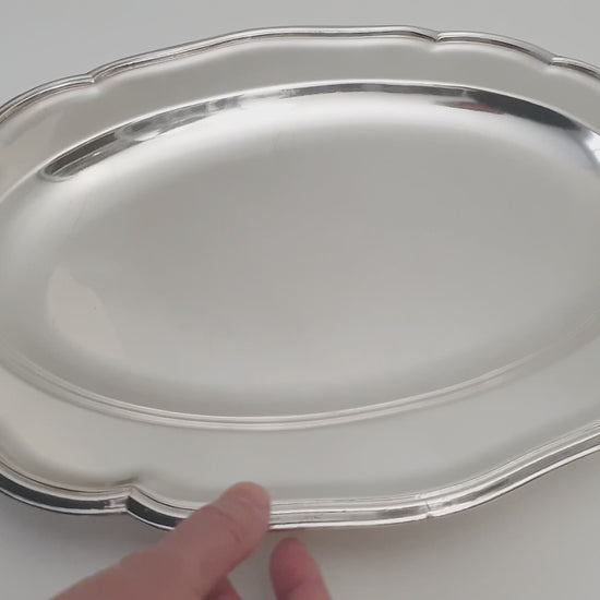 French vintage silver-plated oval serving tray resting on four small feet, giving it an elegant raised profile. Designed with a scalloped border and smooth surface, this platter combines refined French style with practical functionality, ideal for serving, entertaining, or display.