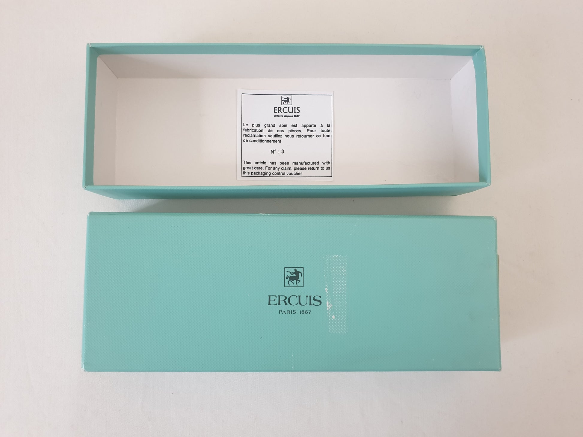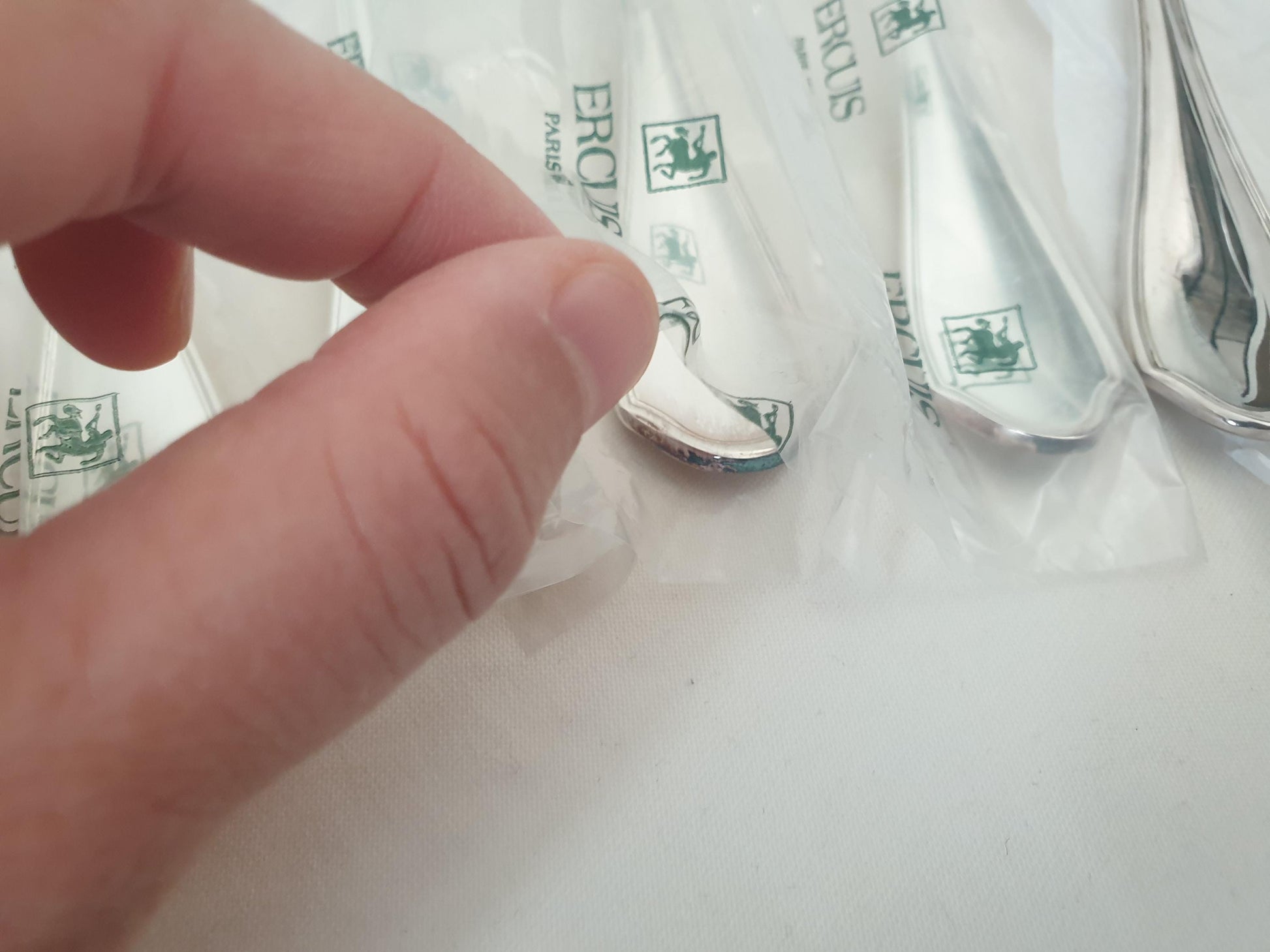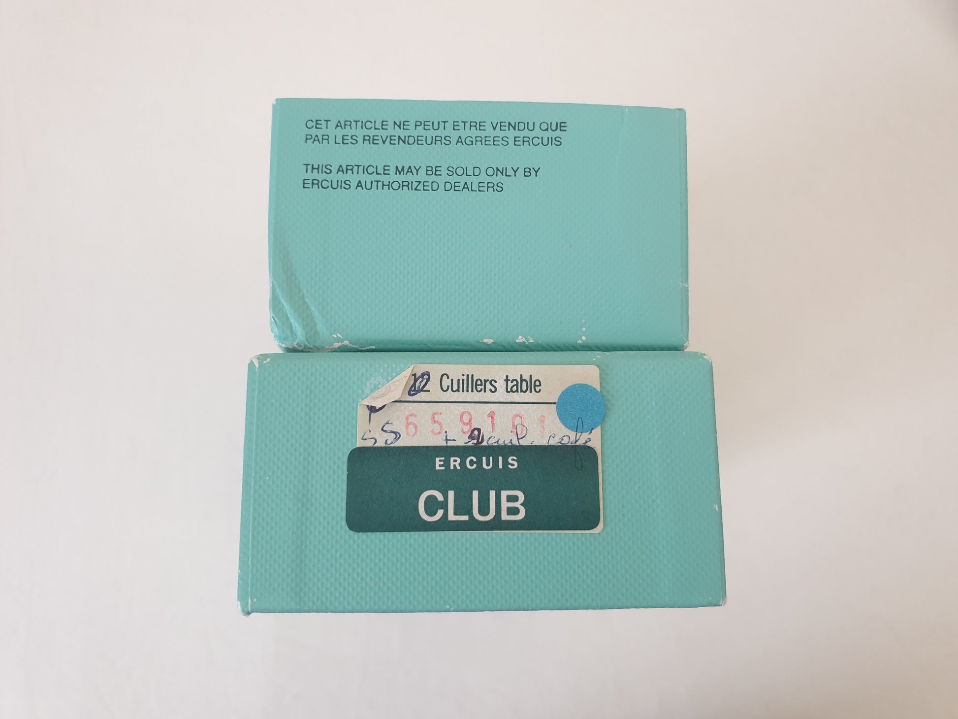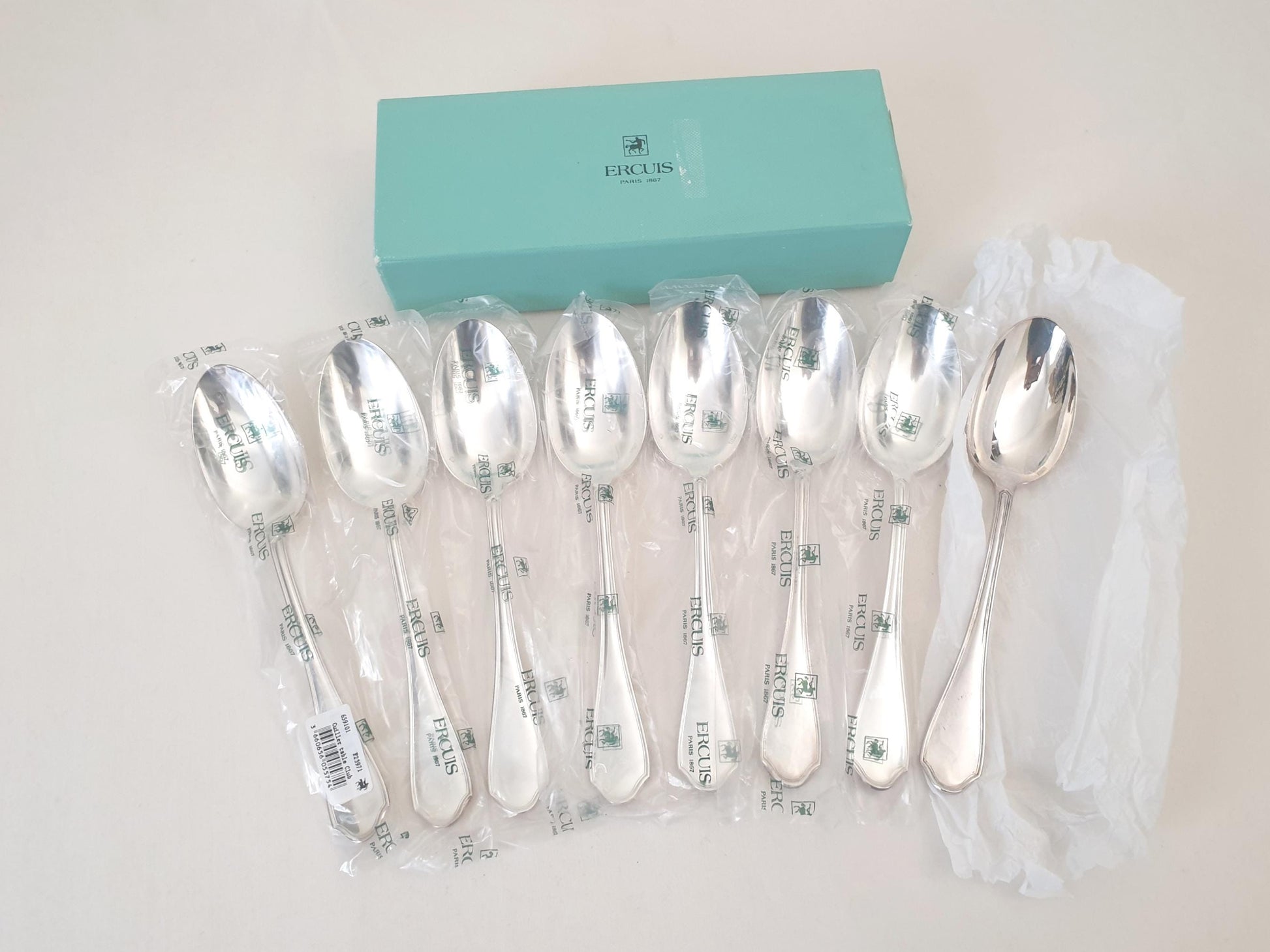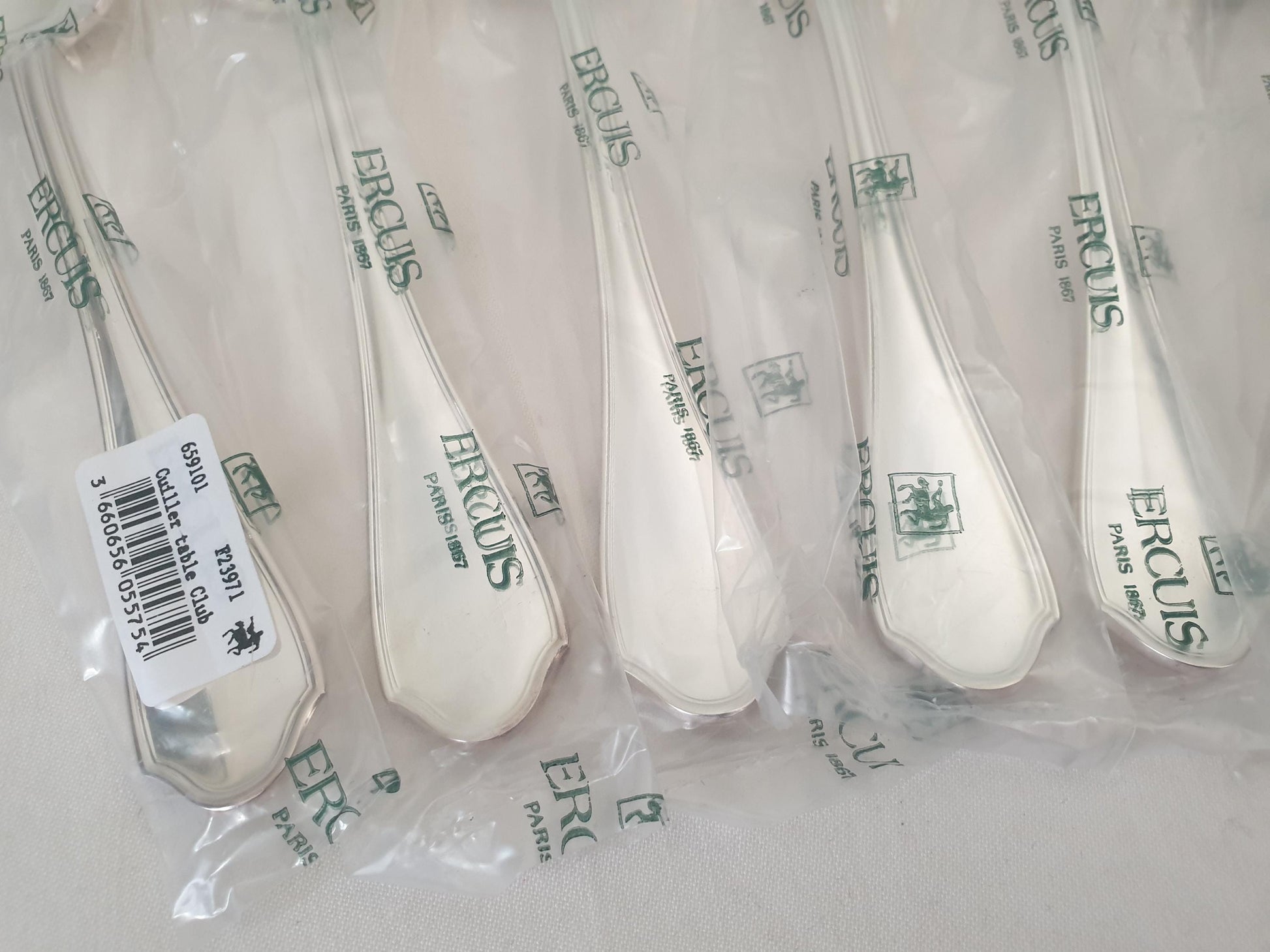 Elegant set of 8 silver-plated table spoons by Ercuis Paris (since 1867), from the Club collection. The set includes 4 spoons sealed in their original bags, 3 in opened bags, and 1 without a bag, all presented in the original Ercuis turquoise box. A timeless addition to any refined table setting or silverware collection.