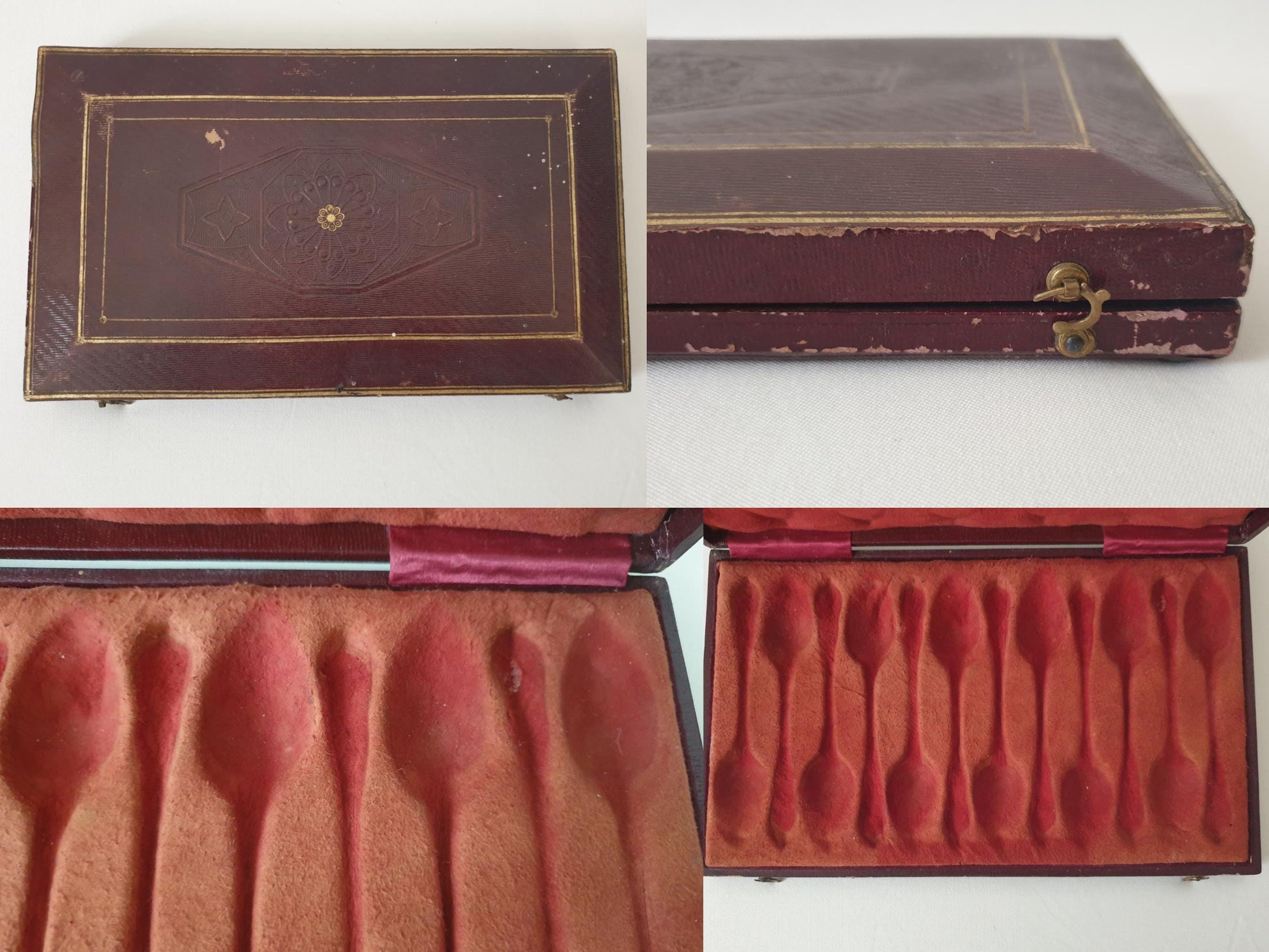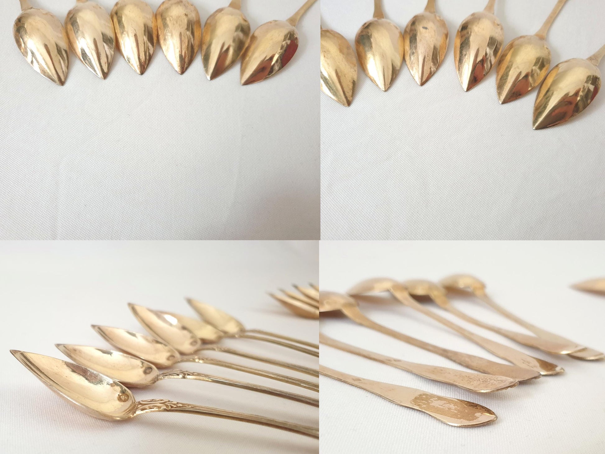 Condition : The set is in good antique condition, with light scratches, tarnish, and slight deformations typical of handmade work. Some gilding has faded but still shows a gold sheen. One spoon bears a mark from a removed sticker on the back of the handle (see photos). Tarnish and marks could be reduced with careful cleaning.