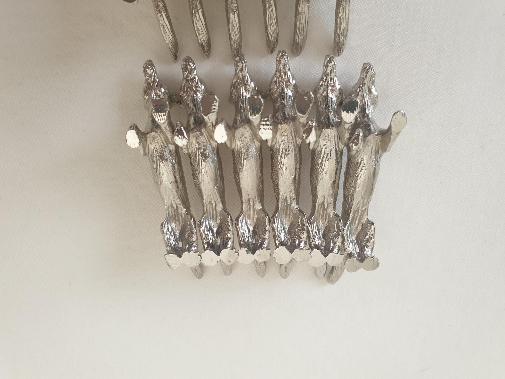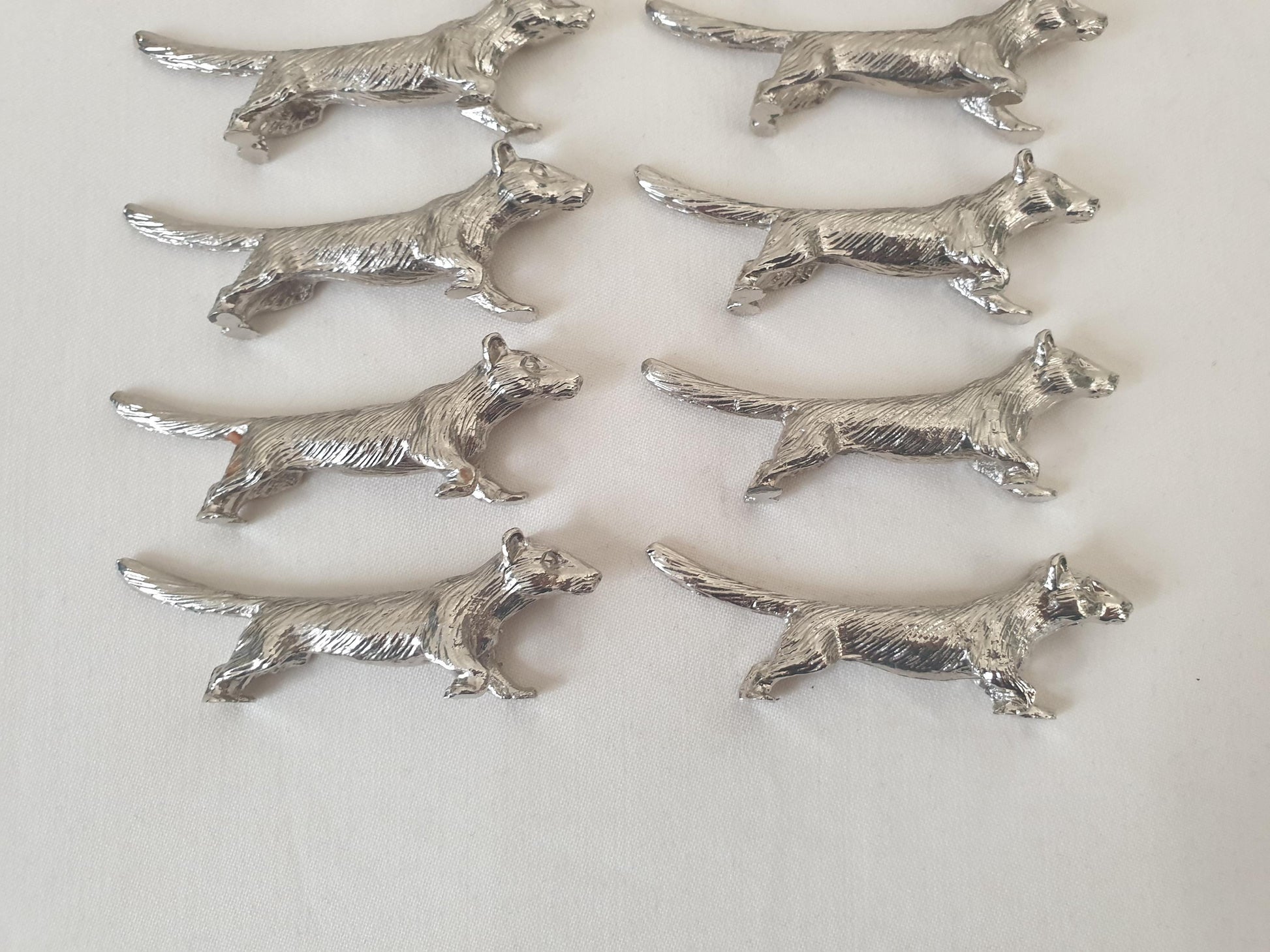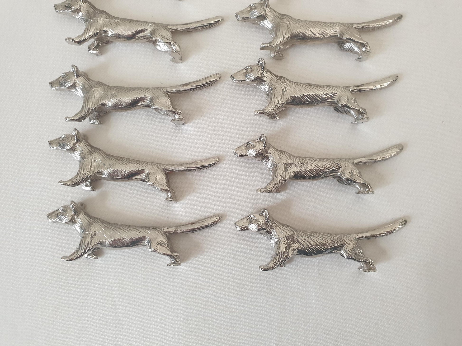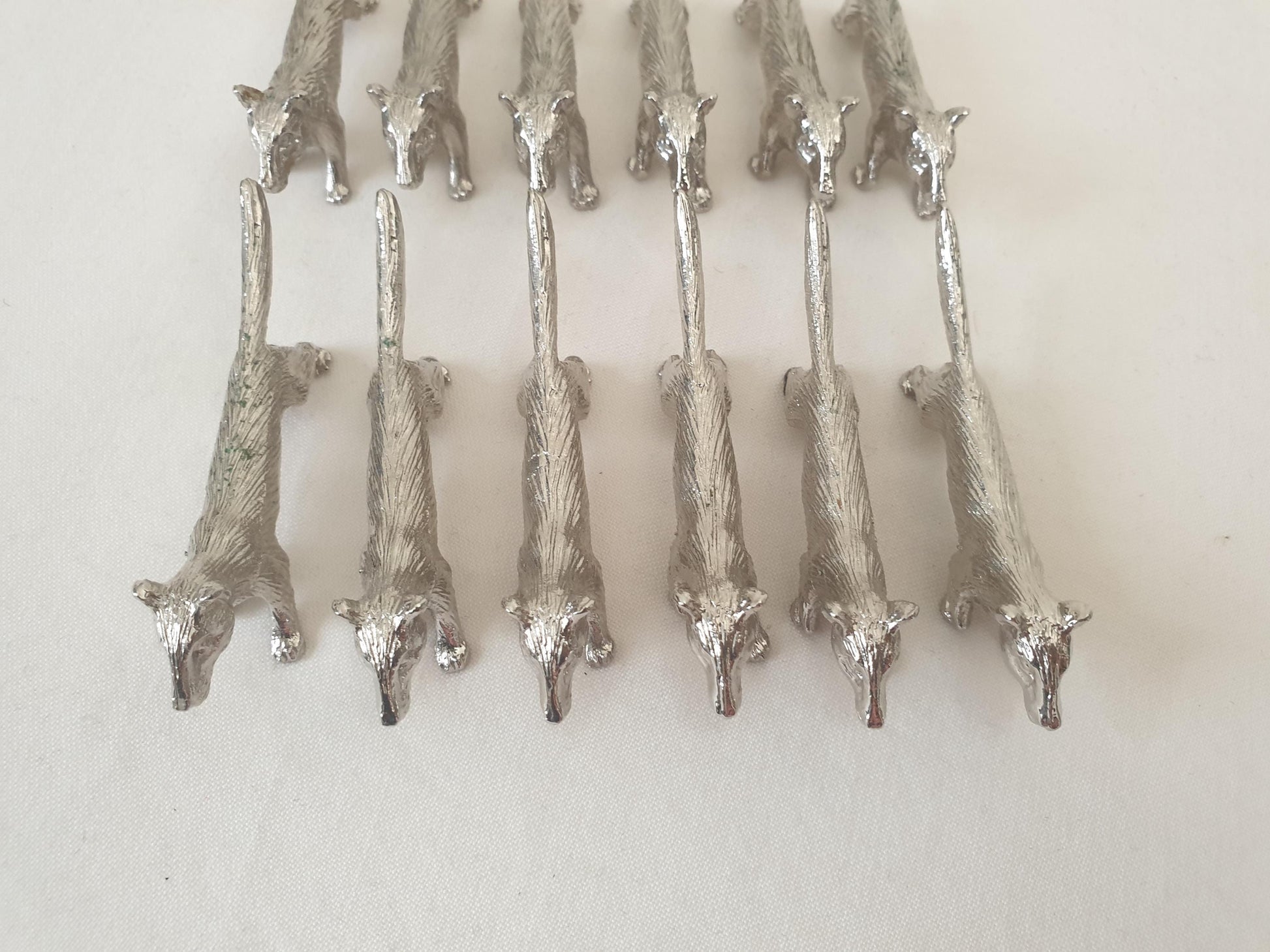 Set of 12 vintage silver-plated fox knife rests, beautifully crafted with fine detailing that captures the elegant, slender form of a fox. Each piece features a textured surface with lifelike fur and pointed snout, adding both charm and character to any table setting.