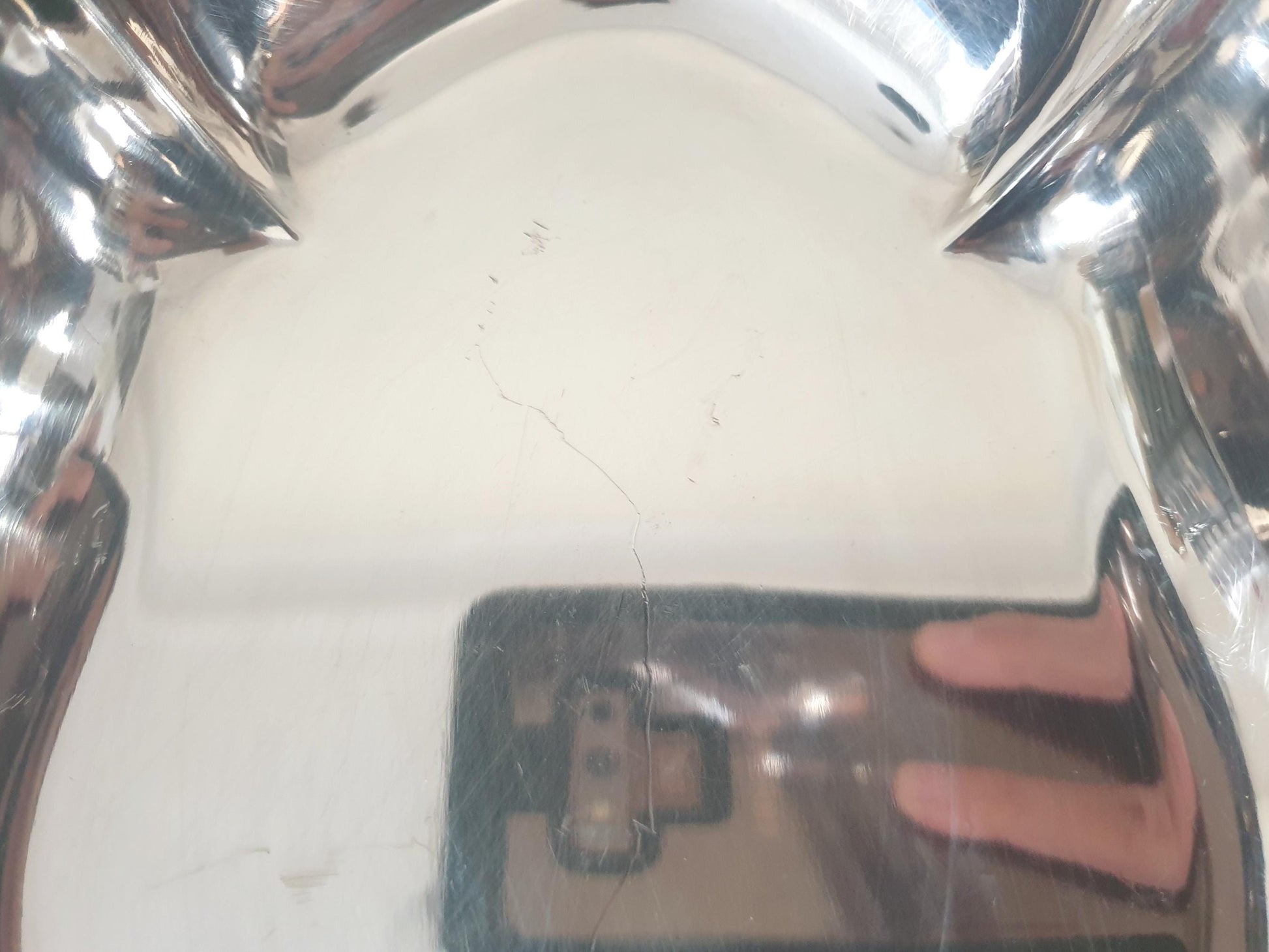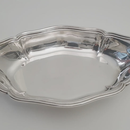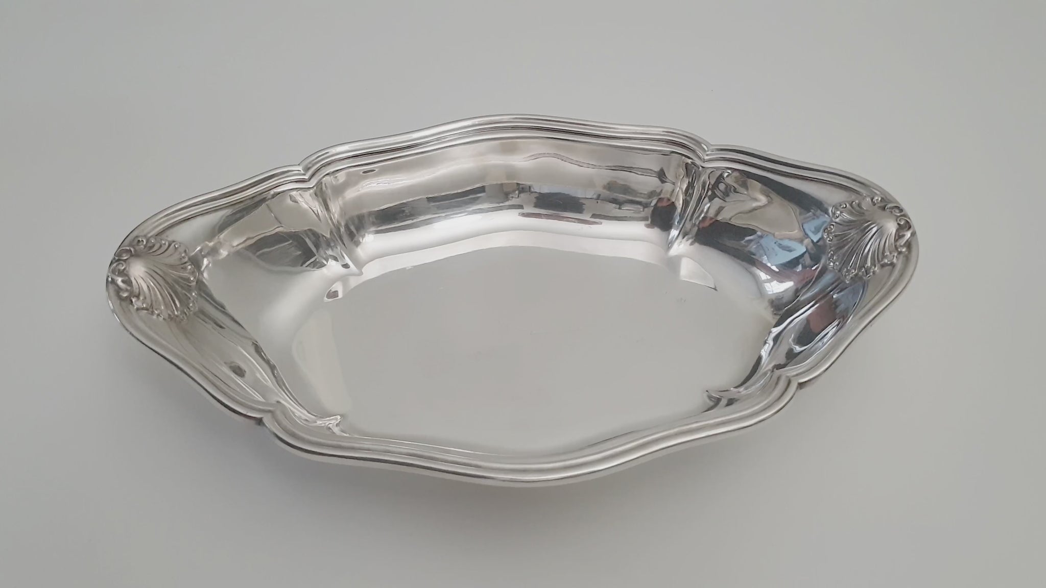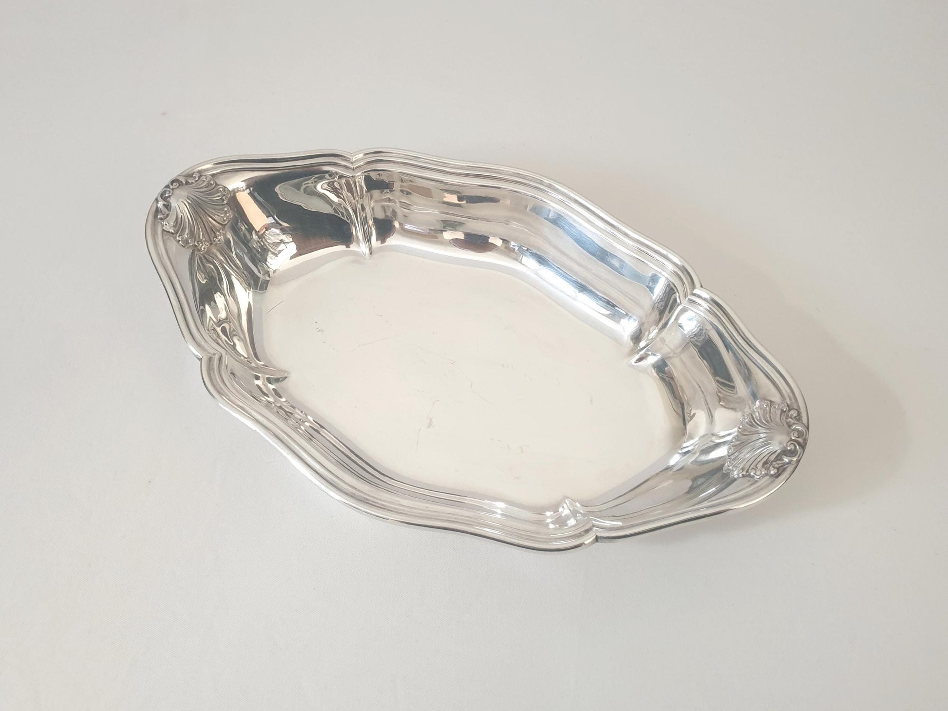 Elegant French vintage bread basket in silver plate, designed in an oval form with scalloped contours and decorative shell motifs at each end. A refined piece that combines timeless charm and practicality, perfect as a bread or fruit basket, serving dish, or table centerpiece.